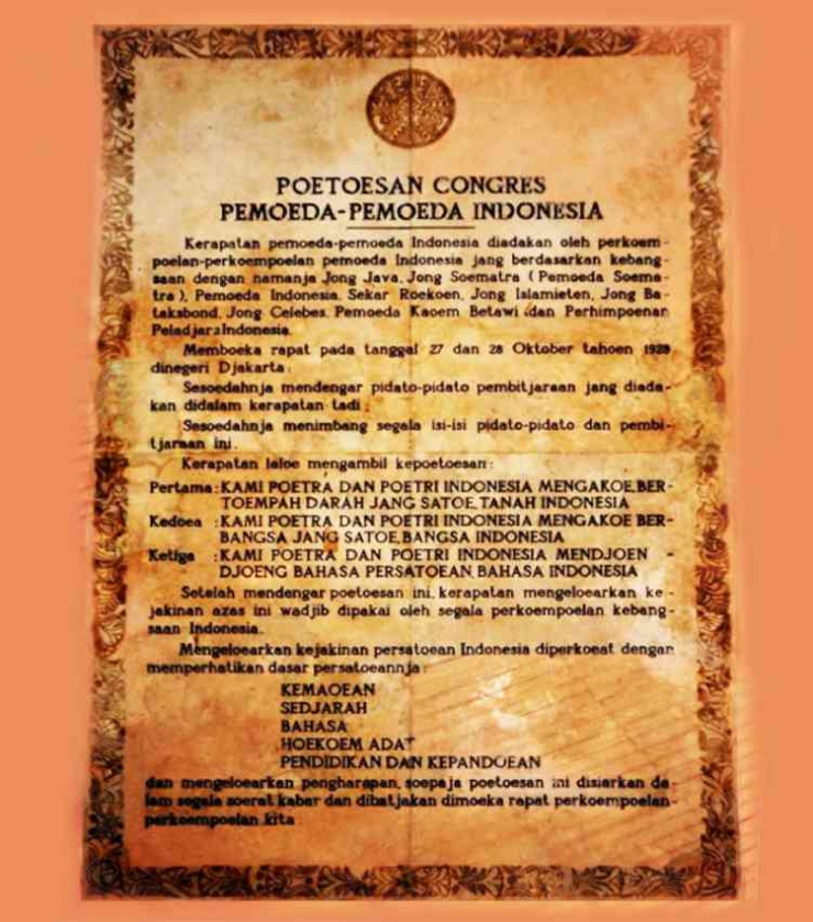 Data statistik diatas selain menunjukan potensi kekayaan budaya, namun juga menjadi tantangan besar kita untuk menjaga keutuhannya, sebab Bangsa dan Negara Indonesia ini merupakan negara yang berbentuk kesatuan dengan bermacam-macam perbedaan suku, ras, budaya, agama dan kepercayaan. Menarik, bagaimana bisa menyatukan bermacam-macam perbedaan yang dimiliki bangsa ini? apa ikatannya? dan akhirnya, sekuat apa “tali” ikatannya?. Pemikiran menyatukan perbedaan yang ada di Indonesia sudah dipikirkan oleh generasi pendahulu kita, paling tidak usaha tersebut tercatat pada tahun 1928, saat peristiwa Kongres Pemuda ke 2. Nanti hasil rumusan tersebut kita kenal dan kenang menjadi “Sumpah Pemuda”. Sayangnya (tanpa mengurangi nilai penting dan sakralnya), kita saat ini banyak yang hanya tahu 3 point pernyataan saja, padahal masih ada dasar persatuan (silahkan lihat duplikat naskah hasil Kongres Pemuda ke 2 diatas). Dalam naskah yang sama, dituliskan bahwa beberapa dasar persatuan kebangsaan Indonesia yaitu “SEJARAH” dan “PENDIDIKAN“. Dua dari beberapa komponen yang menjadi dasar persatuan bangsa ini tidak boleh dilupakan, tidak boleh ditampikan, karena hingga saat ini komponen-komponen tersebut masih relevan dan sangat penting dalam menjaga persatuan bangsa. Seorang Soekarno pun ketika menentukan bentuk negara ini juga mendasarkan dari “SEJARAH“. Sejarahlah yang menyatukan bangsa ini, rasa senasib sependerita akibat dijajah oleh Belanda.